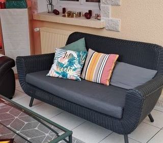 2 Canapés gris en poly rotin de marque Made.com , modèle Jonah Garden , larg 165cm prof 80cm et Haut 80 cm . Avec coussins gris . Possibilité de vente à l unité : 100 €