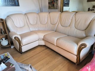 Canapé d'angle en cuir blanc, parfait état, proche du neuf, non convertible, 1,60m X 2,15m, h 1,02m. Sans tâche ni accroc .