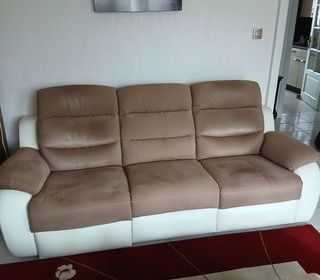 canapé 3 places 1 relax a gauche électrique ,assises couleur marron tétières inclinables accoudoirs et arrière en cuir blanc 2,20 m de long 1m de large très bon état ( changemen