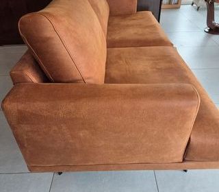 Suite changement de décoration, vends canapé 3 places fixe. Dimensions L210xP95xH88cm Tissu touché peau de pêche. Coloris cognac. Entretien très facile. Structure bouleau massif