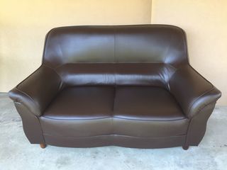 Canapé marron en simili cuir en très bon état, juste un coin à côté du pied un peu abîmé ( voir photo)