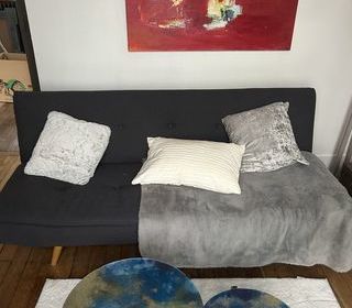 Canapé clic clac gris Très bon état (176 x 85 cm). Compact et pratique, il offre un couchage d'appoint confortable pour accueillir des amis ou de la famille. Tissu propre, ass