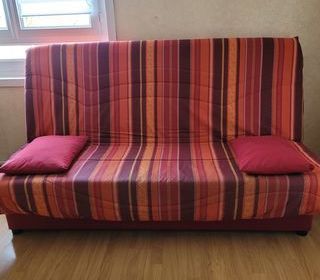 Canapé convertible clic clac coloris tendance rouge accompagné de 2 coussins rouge. Couchage 140, sommier a lattes. Coffre de rangement. Ouverture et fermeture facile. Très peu ser