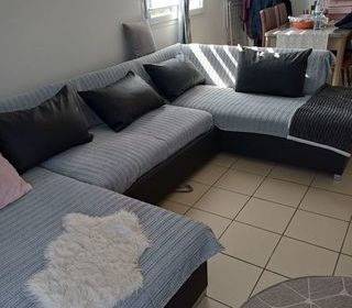 Vend Canapé en U avec couchette tissus gris très bon état et protège par des plaides. très bonne assise. a venir récupérer sur place.