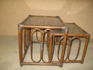 Vends 2 tables gigognes ou en bout de canapé en rotin, en bon état, dessus en verre fumé la gde 59.5cm de long et 46 cm de large le petite 51.5 cm "