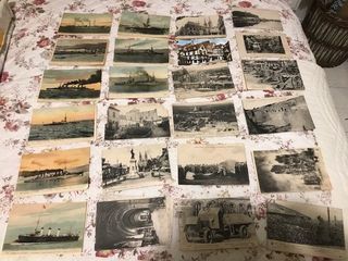 Environ 79 cartes postales anciennes, essentiellement bateaux de guerre et photos militaires Certaines seront à recoller au recto Vendues en l'état sans recours possible