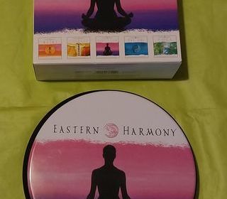 Coffret de 5 CD "Eastern Harmony" + boîte en métal de rangement avec poches plastiques. Coffret détente de 5 CD différents : - Reiki, Chakras, Méditation, Taï Chi, Yoga Très b