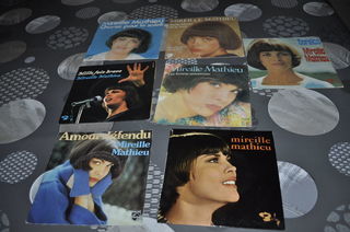 Lot de 45 tours vinyles de Mireille Mathieu, du nombre de 7. Certains comportent plus de deux titres. Quelques traces d'usures peuvent apparaître, étant des versions originales.