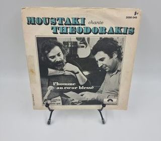 Bonjour, nous mettons en vente ce vinyle 45 tours Moustaki Chante Theodorakis : L'Homme au C?ur Blessé vendu dans son fourreau d'origine (Foureau+Disque). État : Bon, testé et fon