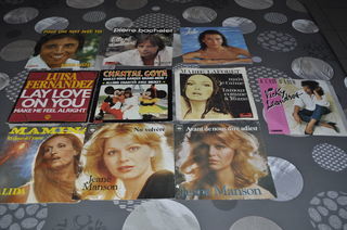 Lot de 45 tours vinyles avec entre autre "Jeane Manson", "Dalida", "Pierre Bachelet" etc... Quelques traces d'usures peuvent apparaître, étant des versions originales. Prix: 10