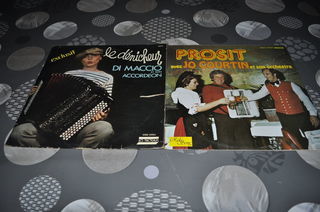 33 tours vinyles de Jo Courtin "Prosit", ainsi que "Le dénicheur" Di Maccio et son accordéon. Quelques traces d'usures, étant des versions originales. Prix: 5 euros le lot