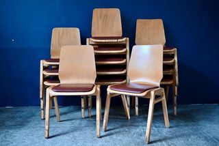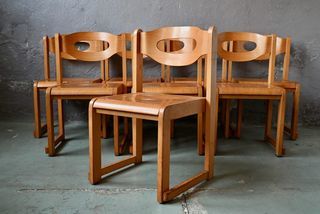 Tout en bois et de teinte dorée ultra lumineuse, dotées d'assises en skaï, ces chaises vintage ont une allure folle. Le dessin est évident, misant sur le confort et la praticité. O
