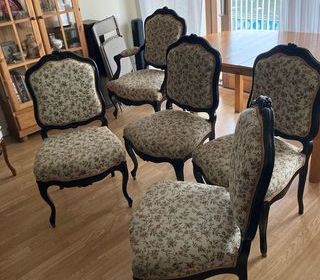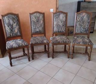 4 chaises de salle à manger dossier haut. Elles sont en bois et l'assise et le dossier recouvert de tissus. 1 chaise comme neuve, les autres sont ternis et une petite usure visible