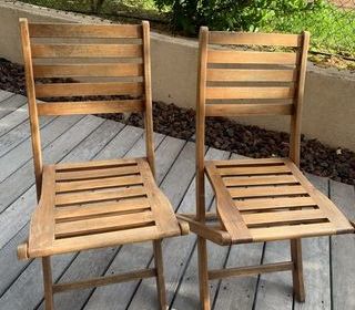 Paire de chiliennes en bois et tissus. Une est dotée d'un repose pied. Elles sont pliantes, ce qui est pratique pour le rangement, ou le transport. Vendues en lot ou séparémen