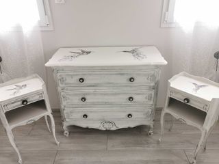 Vends un ensemble pour une chambre à coucher composée d'une commode et ses chevets relookes intégralement avec des peintures écologiques. Dimensions commode : L : 100 cms l : 46,5