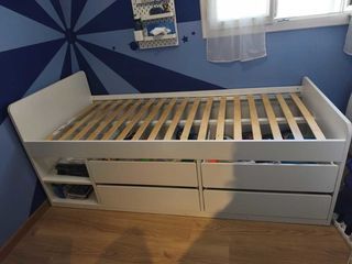 Lit simple blanc avec rangements intégrés. Ce lit possède une structure en bois peinte en blanc, équipée d'un sommier à lattes. Sous le lit, quatre tiroirs spacieux permettent un r