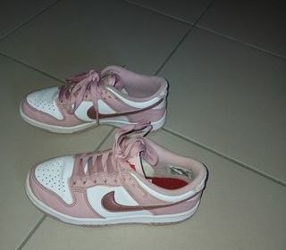 Vends une paire de baskets en cuir à lacets, marque Nike Dunk low, couleur rose velvet, pointure 36. Longueur pied 24 cm. Très peu servies, achetées fin 2025 mais déjà trop petit