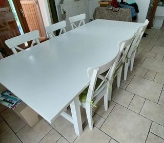 Vends table rectangulaire bois blanc 90 par 220 Soit seule à 180 euros soit avec 6 chaises 300 euros très bon état