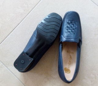 Paire de mocassins de marque OMBELLE, neuve, jamais utllisée. Pointure 41, hauteur talon 3 cm, coloris bleu marine. Règlement uniquement en espèces, ni chèque, ni paypal. Pa
