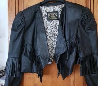 Blouson noir en cuir avec des franges taille 40/42 mesure aisselles a aisselles 60 cm hauteur 54 cm excellent etat porte une fois 40e