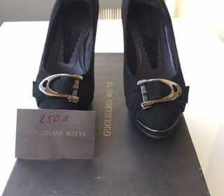 Escarpins luxe marque Guglielmo Rotta en daim noir ( valeur 250€ ) , très bon état général, semelles neuves; boucle argentée, talons dégradés argentés. Taille 35 Italien équivalent