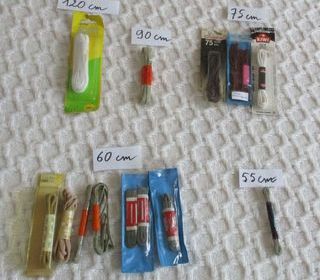 14 paires de lacets neufs, différentes longueurs et différentes couleurs, plats et ronds. 120 cm : 1 paire lacets sport plats blancs. 90 cm : 1 paire lacets plats beige. 75 cm :