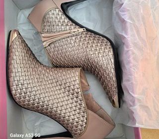 Low boots beige tout cuir. Tressé à l'avant cuir lisse à l'arrière dorure fantaisie sur bout pointu , talon 10,8cm.mis pour 1 occasion état proche du neuf. Taille 38 Prix boutiq