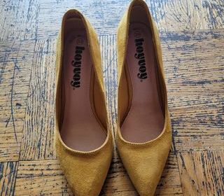 À vendre : Une paire de chaussures pour femme, en daim couleur jaune moutarde, avec un intérieur en cuir brun. Pointure visible sur la photo : 39. La chaussure est de style balleri