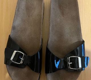 Claquettes BATA, Noir verni Taille 39, Longueur semelle 26cm. Convient pour un pied de pointure 39 ou 39,5. Bride à boucle réglable. Semelles non usées, photo. Bon état.