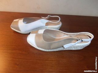 Type : Chaussures femme Pointure : 40 Sandales de couleur blanche et taupe, dessus et semelle en cuir, talons compensés, marque originale BALERI, taille 40. Excell