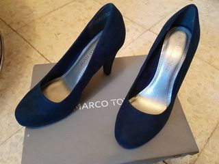 À vendre : Une paire de chaussures à talons, bleues marines, marque Marco Tozzy, taille 38, talons 7 cm environ, comme neuves, jamais portées, 15 euros, à venir récupérer sur