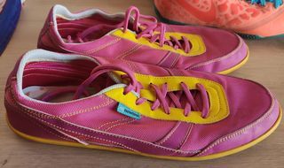 Baskets roses et jaunes en très bon état, seule la semelle intérieure se décolle au talon
