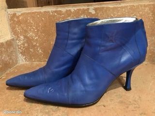 boots free lance en cuir de couleur bleue taille 37,5 étoiles incrustées dans le cuir légère trace derrière chaussure et sur le bout bon état ressemelées par cordonnier d'autres ph