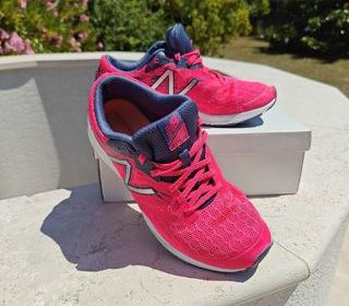 Je vends une paire de chaussures de running pour femme, de marque New Balance, modèle Speedride Flash-RN, rose et bleu marine, avec semelle épaisse, en taille 41,5 en très bon état