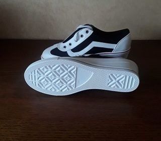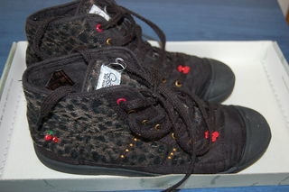baskets toile, talon compensé, semelle caoutchouc, fermeture à lacets, légères et confortables. Attention taille un petit 40. liseret rouge et noir neuves namais portées.