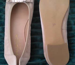 Ballerines beige clair, talon 3 cm, jamais portées, semelles élastomère, intérieur semble en cuir, marque Hirica, assez confortables.