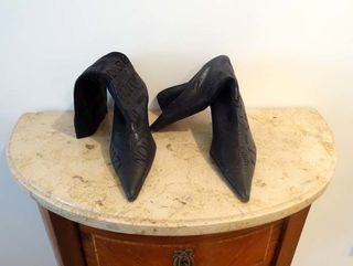 Particulier vend une paire de bottes à enfiler arrivant au mollet. En matière souple (élastique) avec des motifs en filigrane. Bout pointu en cuir. Talons aiguille de 5 cm. Semelle