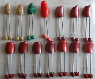 Particulier vend Embauchoirs /Mise en forme chaussure. Couleurs rouge, bordeaux, vert, beige marbré. Longueur totale de 28 à 30 cm. La tige flexible en métal permet de s'adapter au