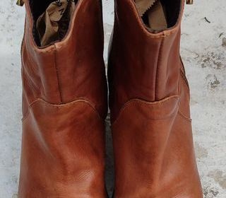 Je vends cette paire de bottines en cuir marron. - Type de produit : Bottines - Univers : Femme - Pointure : 41 - Couleur : Marron - Matière : Cuir - Taille talon : 8,5 cm -