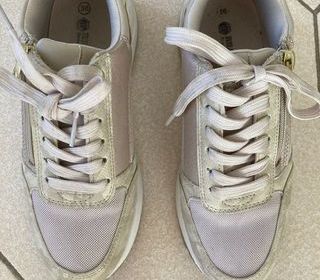 Belles Baskets Femme, fille marque Rhapsody Chaussures très élégantes, très confortables et légères Couleur beige et doré Taille 36 Fermeture Zip + lacets En très bon état