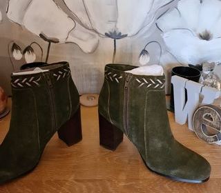Vends très belles bottines cuir et daim. Couleur vert. Pointure 39. Neuves et dans boîte. Valeur magasin 89 euros.