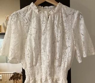 Je vends un chemisier dentelle, blanc, Marque La Petite Etoile. Taille 38. Chemisier entièrement doublé, non transparent. Petites manches. Porté 2 fois seulement. Remise en mai
