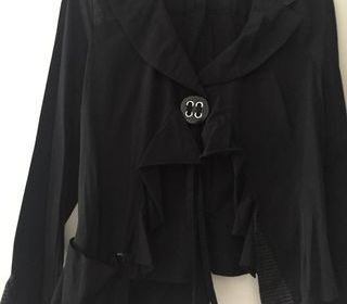 VESTE LEGERE CHEMISIER NOIRE avec le col rayé argent ainsi que sur les coté et rappel sur les manches marque mE -manches longues - col en V avec volants Taille 3 ou L Bouton