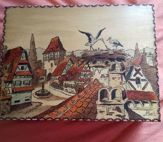 Joli coffre bois représentant village Alsacien avec nid de cigognes signé . 40X30X10 signé BOLI . bon état