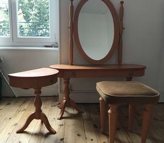 Coiffeuse vintage + tabouret assorti, charme rétro ! Je vends cette coiffeuse vintage en bois avec son miroir ovale orientable, accompagnée d'un tabouret assorti et d'une petite