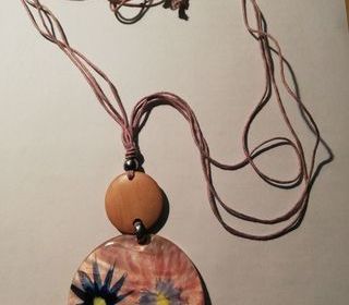 COLLIER/SAUTOIR médaillon nacre, fleurs peintes à la main vernissé 1 pendentif formé de 2 pièces 1 en bois diamètre 3 cm 1 en nacre de diamètre 6,5 cm environ s'enfile par la