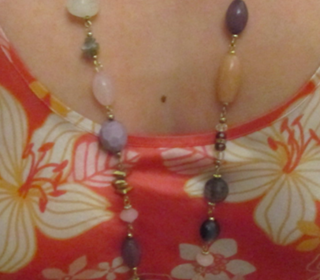 Collier long type sautoir (45 cm porté) composés de perles en plastique de couleurs et de pierres colorées, montées sur une chaîne dorée. Couleurs dominantes : violet, bleu, rose,