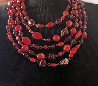 Collier perles rouges - 5 rangs - Vintage Très belle pièce de bijou fantaisie vintage non signée. Colier plastron, pièce unique unique aux superbes reflets Style Fantaisie, Art