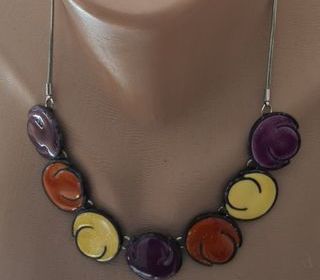 Ancien Collier fantaisie et élégant à la fois, bien travaillé et dessiné par Ikita... Les 7 pendentifs en émail orangé pailleté alternés avec des Perles fantaisies rosées * Marq