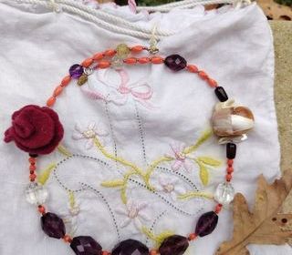 COLLIER TISSU CORAIL ET PERLES FAIT MAIN
